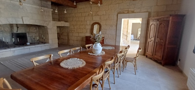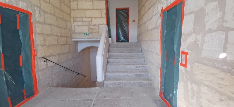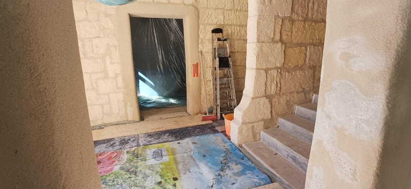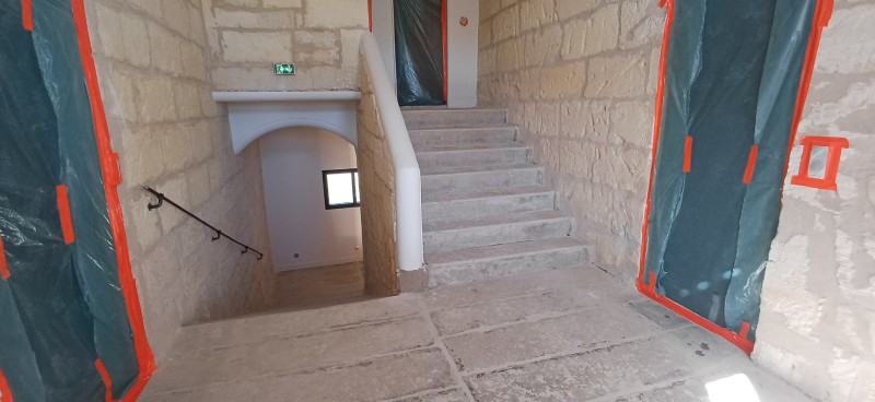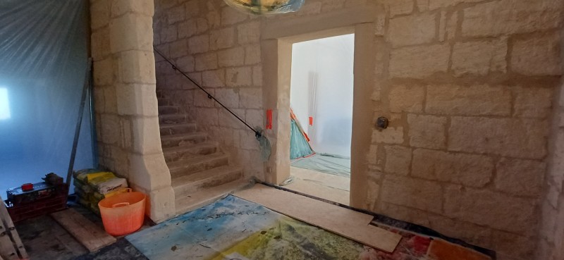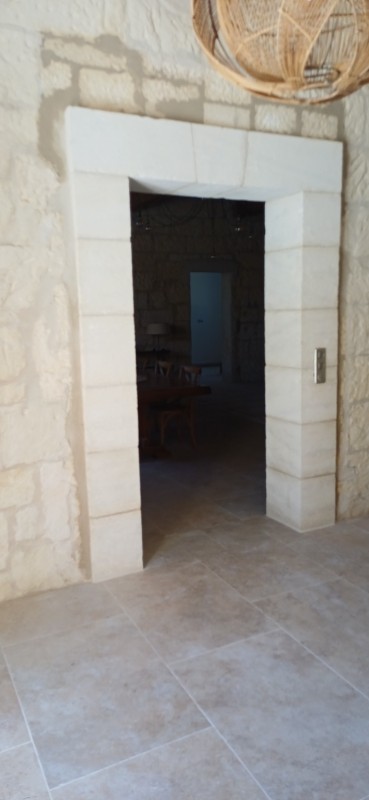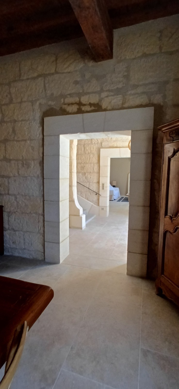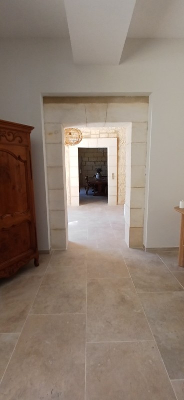 Concernant les encadrements de portes donnant sur le hall d’entrée, nous avons procédé à un décroutage des enduits existants pour les remplacer par des pierres massives taillées sur mesure, évidées en forme de “U” pour faciliter la mise en œuvre.